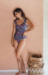 Enterizo para mujer con tiras  drapeadas a lo largo de los hombros.  Incluye copas suaves.Cubrimiento medio en la parte posterior del panty. Completamente forrado. Este diseño lo recomendamos para todas las siluetas. Estampado exclusivo. Completamente forrado.